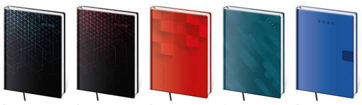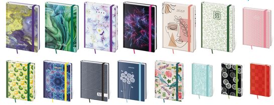 Představujeme moderní typ diářů s vyměnitelnými deskami a variabilním obsahem. Praktické desky jsou vybaveny poutkem na tužku, magnetickou uzavírací klopou a jejich okraj ozdobí obšití nití. Desky je možno použít opakovaně pro zápisníky i diáře, proto neobsahují ražbu letopočtu.