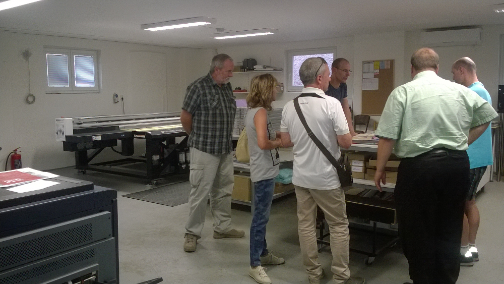 Místnost se sítotiskem nás ohromila svou „barvitou vůní“. K našemu překvapení stará dobrá technologie ručního nanášení barvy stále žije a s úspěchem doplňuje moderní tiskařské stroje s digitálním tiskem. Náš největší obdiv ale sklidilo nejmodernější digitální zařízení od firmy Minolta. Možnosti těchto strojů jsou téměř nevyčerpatelné, omezené snad jenom našimi nápady. Chcete přítisk na kalendáře, na sklo, dřevo, či kachličky? Žádný problém!